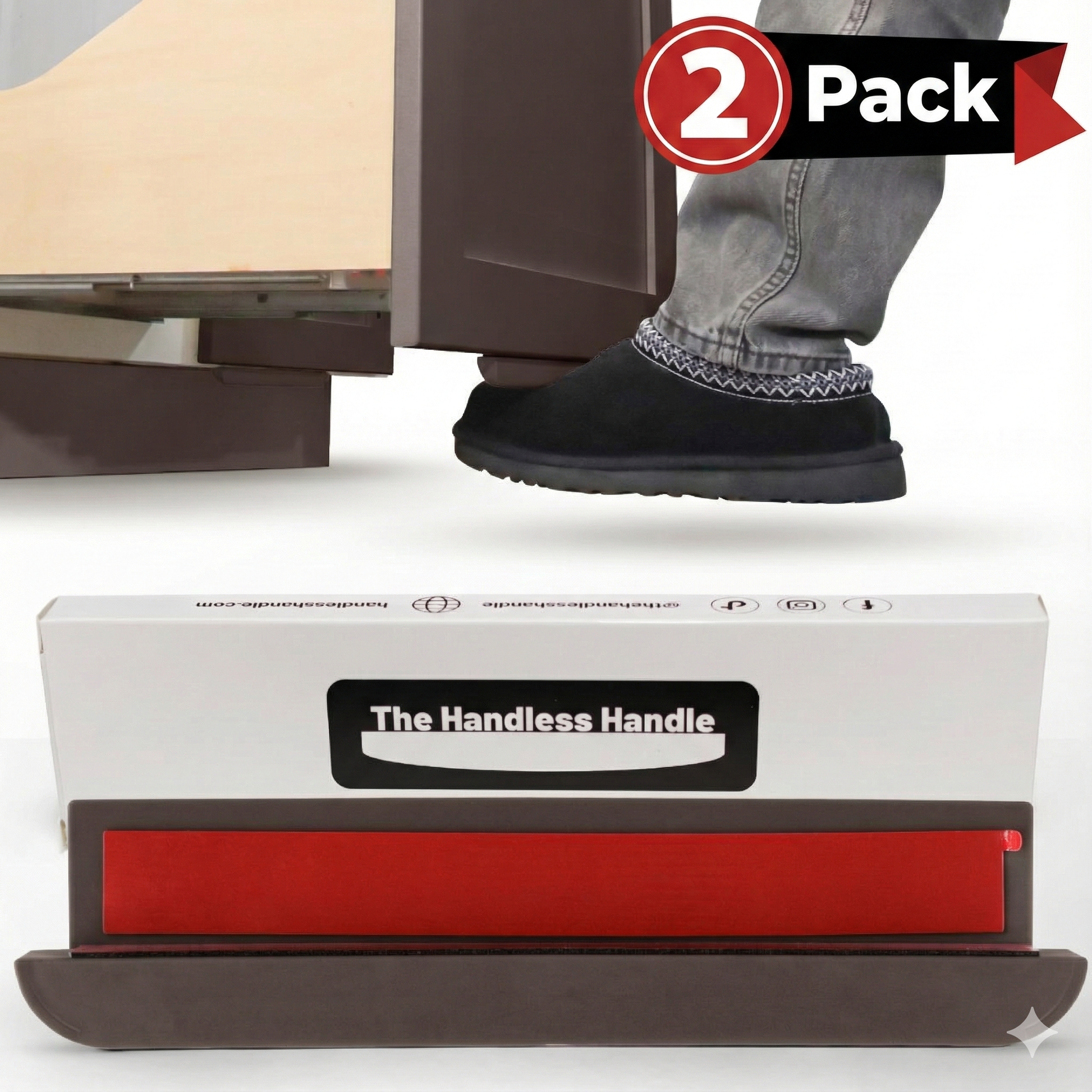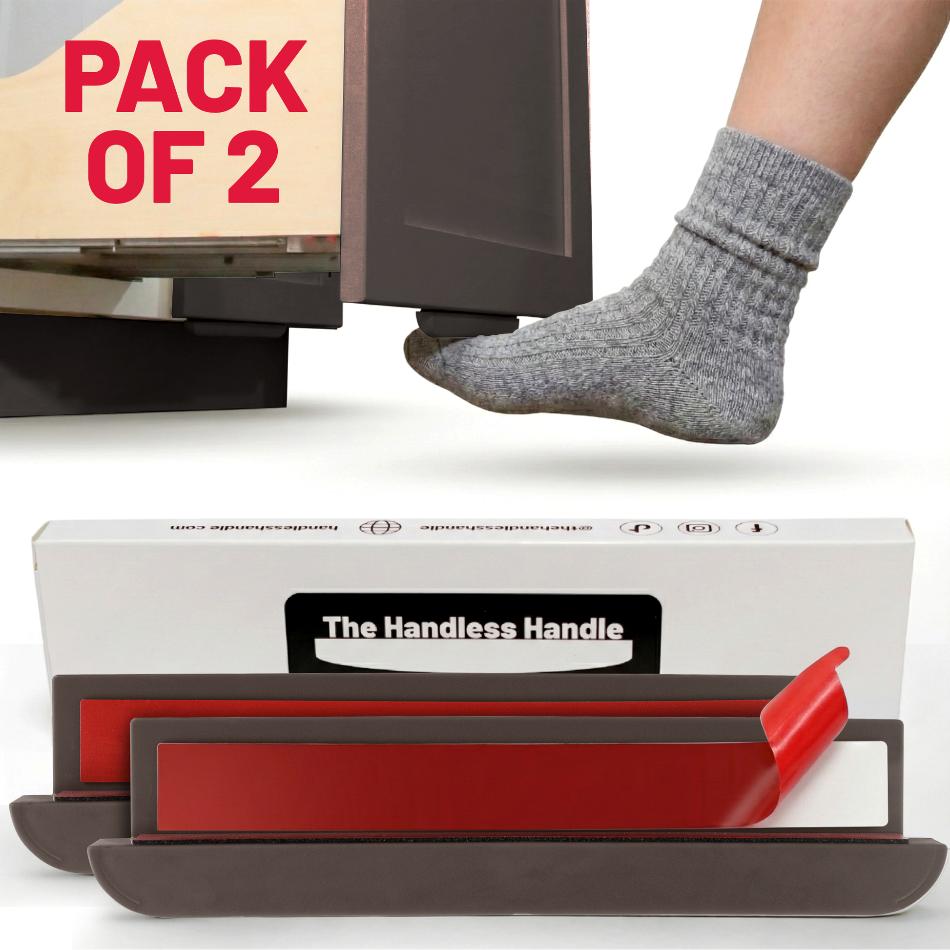 The Handless Handle is a discrete attachment that quickly turns your pull-out garbage can and cabinets hands-free. Simply put, this is a peel-and-stick handle for your foot to stop the spread of bacteria while cooking with The Handless Handle. Additionally, The Handless Handle protects your cabinets from water and food damage and will keep your cabinets looking new forever!
