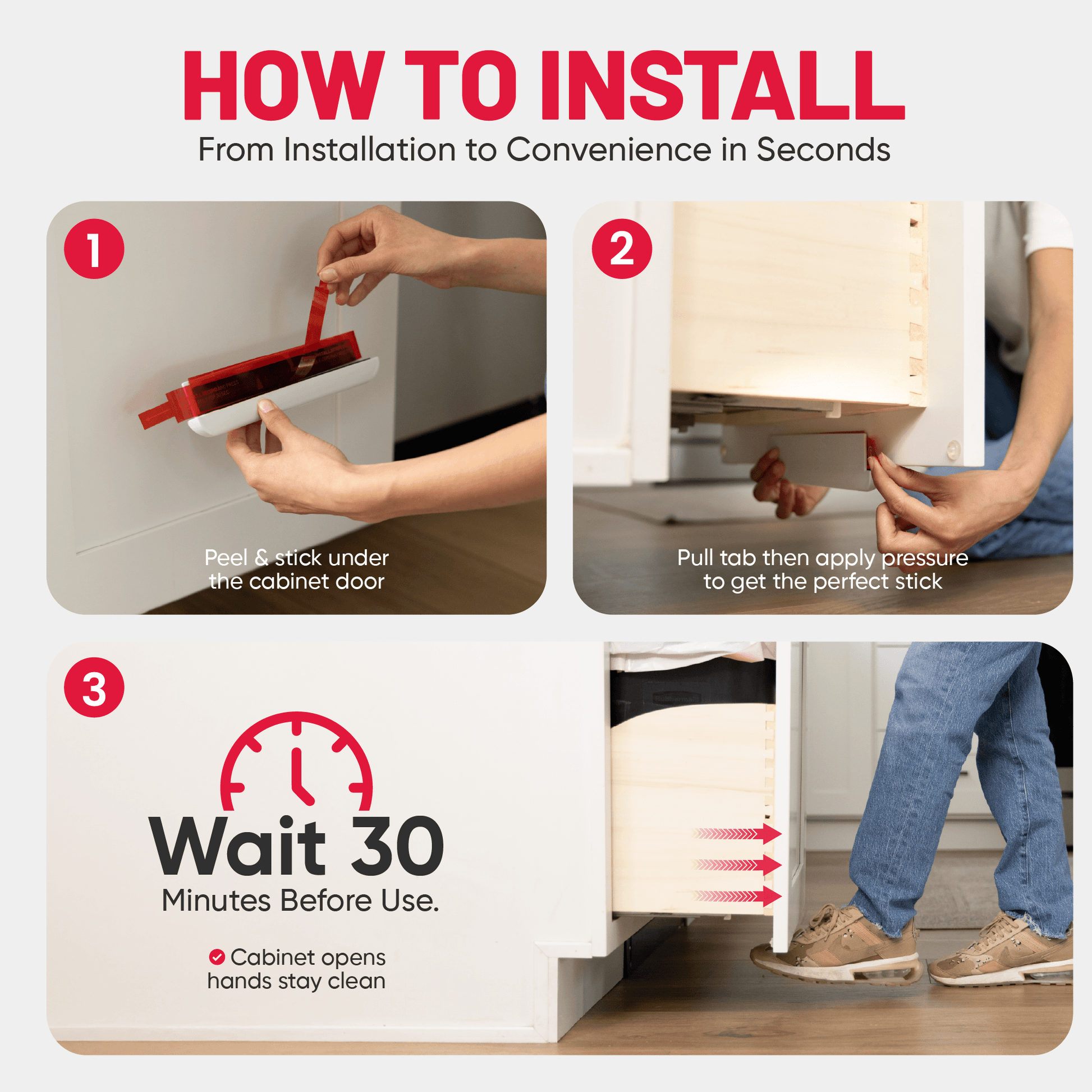 - [OVERALL EASE] With a simple peel-and-stick attachment, The Handless Handle can be installed by anyone in under 1 minute. This hand-free cabinet and garbage opening system is ergonomic providing a comfortable and natural experience while using your foot. Our specialized design and texture make this ideal for use frequently.